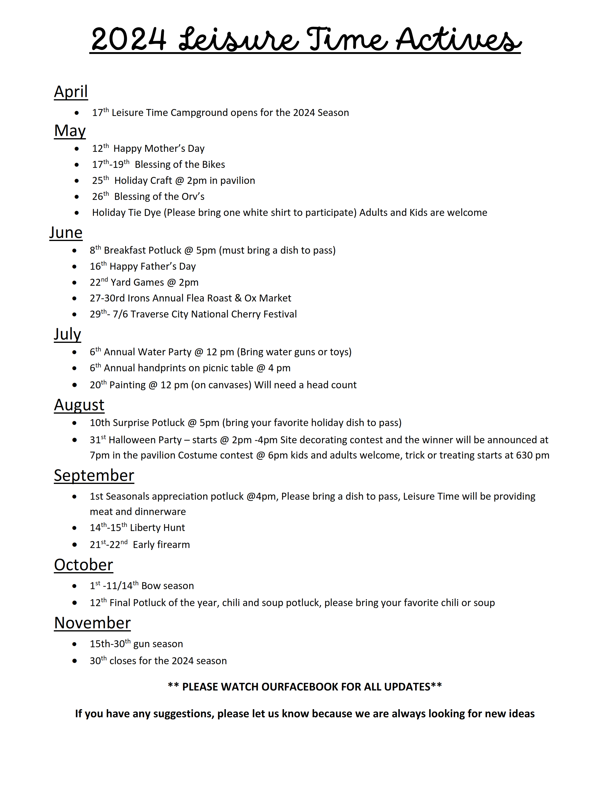 2024 Calendar of Events / Activities Click here for the latest campground events and activities listed on our facebook page